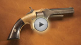 The gutta percha casing seen here is an original example. Most of these early thermoplastics have not survived; consequently, they are rarely seen today. The S&W No. 1, Ist Issue revolver model inside was manufactured from 1857 to 1860 and about 11,000 were made.
